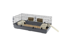 Rabbit 140 - очень просторная клетка, идеально подходит для содержания одного или нескольких кроликов. Идет в комплекте с аксессуарами, среди которых: две пластиковые кормушки для сена, две поилки и две миски. Имеет два домика для отдыха со ступенчатой панелью для легкого передвижения наверх. Вы можете разместить домики в любом месте по вашему желанию. Также имеется пластиковая лесенка, по которой кролик может с легкостью выйти из клетки и погулять вокруг нее.