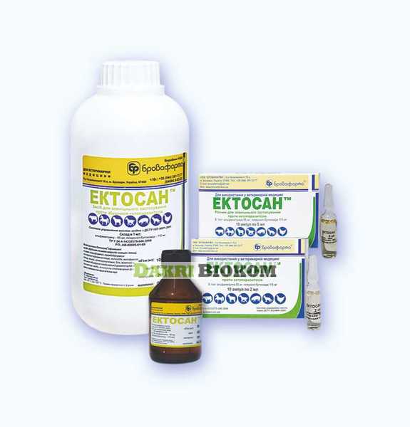Прімененіе.Профілактіка і лікування тварин (велика рогата худоба, вівці, кози, коні, свині, собаки, кішки, домашня птиця) при інвазування їх ектопаразитами, чутливими до компонентів складу Ектосанутм.
