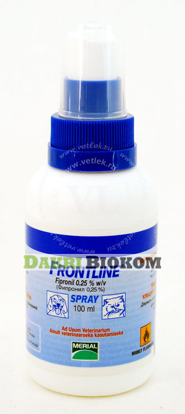 Фипронил обладает выраженным контактным инсекто-акарицидным действием в отношении эктопаразитов кошек: вшей, блох, власоедов, иксодовых клещей, а также хейлетиелл и возбудителя ушной чесотки. Механизм действия фипронила заключается в блокировании ГАМК-зависимых рецепторов паразита, в нарушении передачи нервных импульсов, что приводит в конечном итоге к параличу и гибели паразитов. Фипронил не оказывает влияния на ГАМК-рецепторы млекопитающих. При нанесении на кожу животного препарат практически не всасывается и в течение суток равномерно распределяется по поверхности тела, накапливаясь в сальных железах кожи, оказывая при этом продолжительное инсекто-акарицидное действие. Фронтлайн спрей по степени воздействия на организм теплокровных животных относится к малоопасным веществам и в рекомендованных дозах не оказывает резорбтивно-токсического, сенсибилизирующего, эмбриотоксического, тератогенного и мутагенного действия. При попадании в глаза вызывает слабое раздражение.