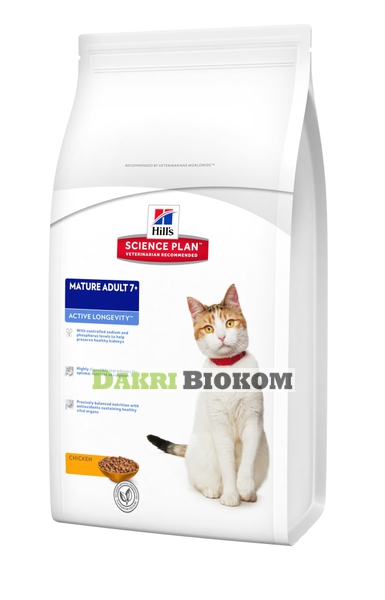- Hill's™ Science Plan™ Feline Mature Adult 7+ Active Longevity™ Курица помогает защитить почки и функции внутренних органов. Разработан с клинически доказанными антиоксидантами, омега-3 жирными кислотами и сниженным уровнем фосфора.