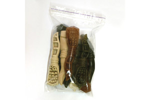 Лакомство для очистки зубов собак выглядит в виде открытого тюбика зубной пасты, одна из сторон которого имеет сложный рельеф для эффективной очистки ротовой полости и массажа десен. Выпускается в разных размерах и цветовых решениях.