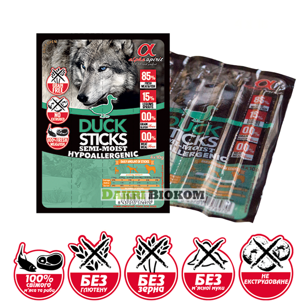 Alpha Spirit Sticks - смачні гіпоалергенні беззернові напіввологі ласощі для собак, що містять 85% високоякісних свіжих м'яса і риби. Можуть служити корисним доповненням до основного харчування Вашого вихованця. Випускаються в семи різних варіантах. Залежно від виду ласощів в якості основного інгредієнта м'ясо: яловичини, ягняти, курки, качки, печінки, риби, а також ласощі c сиром і йогуртом.