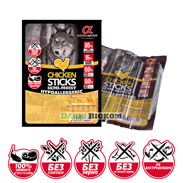 Alpha Spirit Sticks - смачні гіпоалергенні беззернові напіввологі ласощі для собак, що містять 85% високоякісних свіжих м'яса і риби. Можуть служити корисним доповненням до основного харчування Вашого вихованця.