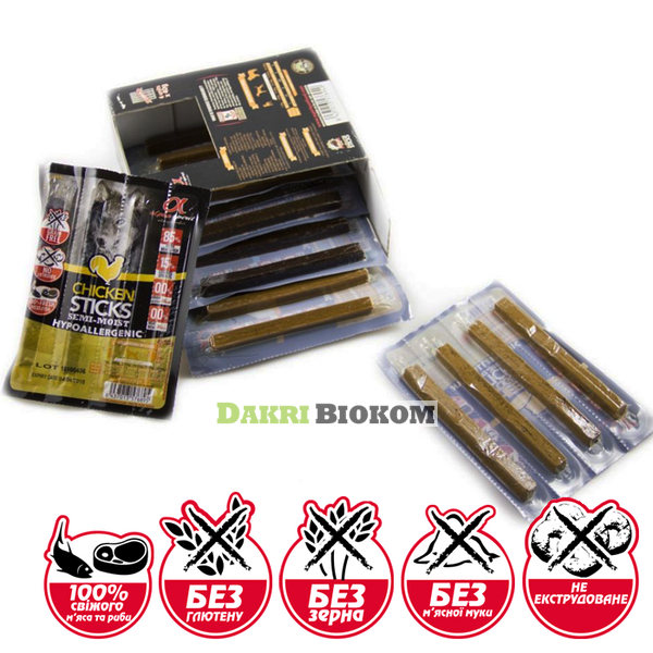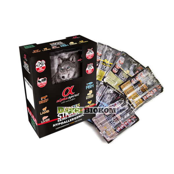 Alpha Spirit Sticks - смачні гіпоалергенні беззернові напіввологі ласощі для собак, що містять 85% високоякісних свіжих м'яса і риби. Можуть служити корисним доповненням до основного харчування Вашого вихованця. В одній упаковці міститься шість різних варіантів смаку. М'ясо: яловичини, ягняти, курки, печінки, риби, а також ласощі c сиром і йогуртом.