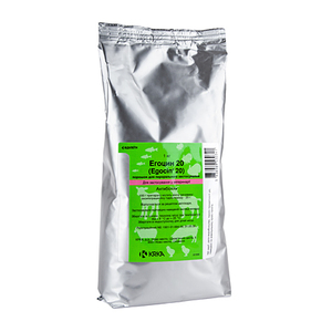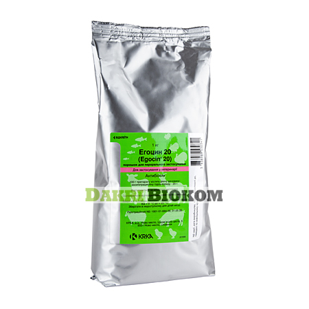 Загальні відомості Егоцин 20 % порошок (Egocin 20 %) – антибактеріальний препарат, який містить в якості діючої речовини 200 мг/г окситетрацикліну гідрохлориду. Зовнішній вигляд – порошок від кремового до блідо-жовтого кольору, добре розчинний у воді. Випускають препарат, розфасованим у пакети ламіновані фольгою по 100 г, 1 кг та паперові мішки по 25 кг. Зберігають в сухому, темному місці при температурі від +8° до +25°С. Термін придатності – 3 роки.