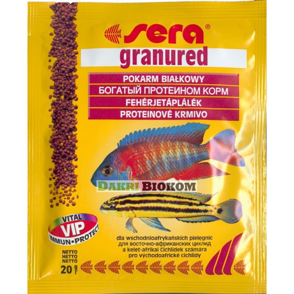 Этот гранулированный корм имеет высокое процентное содержание высококачественных белков из водных организмов и поэтому предназначен для преимущественно хищных цихлид. При комбинировании с кормом sera гранугрин (sera granugreen), грануред является интересным разнообразием также и для всеядных видоврыб. Вновь посаженные рыбы переходят на этот корм безпроблем. Корм сохраняет свою форму и таким образом остается привлекательным для рыб и после погружения.