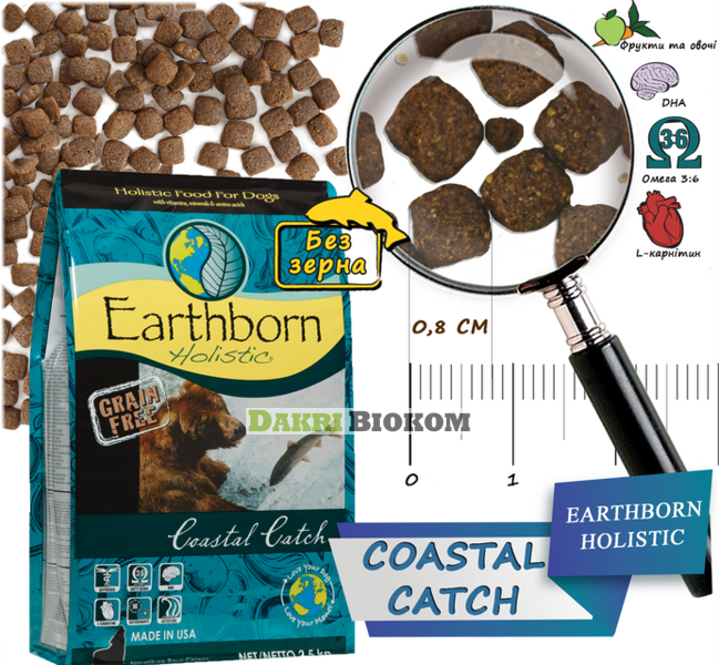 EARTHBORN HOLISTIC Coastal Catch - це найсучасніше альтернативне беззернове харчування холістик класу на основі м'яса білої риби для собак на усіх стадіях життя. До складу входять корисні та поживні інгредієнти: біла риба (30%), фрукти та овочі (9%).