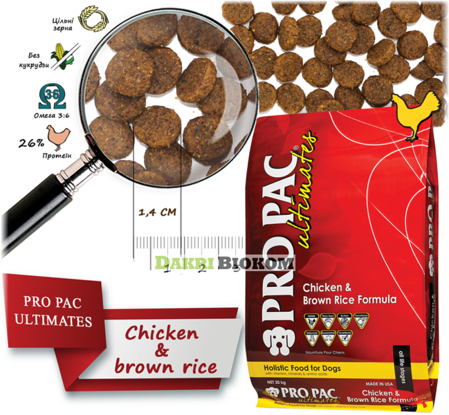 PRO PAC Ultimates Chicken & Brown Rice Formula – це свіжий підхід до харчування суперпреміум класу. Формула містить прості та поживні інгредієнти: курку (20%), цільні зерна рису (15%), фрукти та овочі (12%).