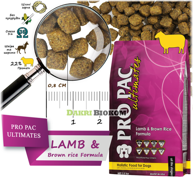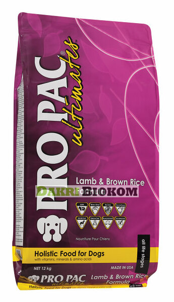 PRO PAC Ultimates Lamb & Brown Rice Formula– це свіжий підхід до харчування суперпреміум класу. Формула містить прості та поживні інгредієнти: ягня (>20%), цільні зерна рису (16%), фрукти та овочі (>12%).