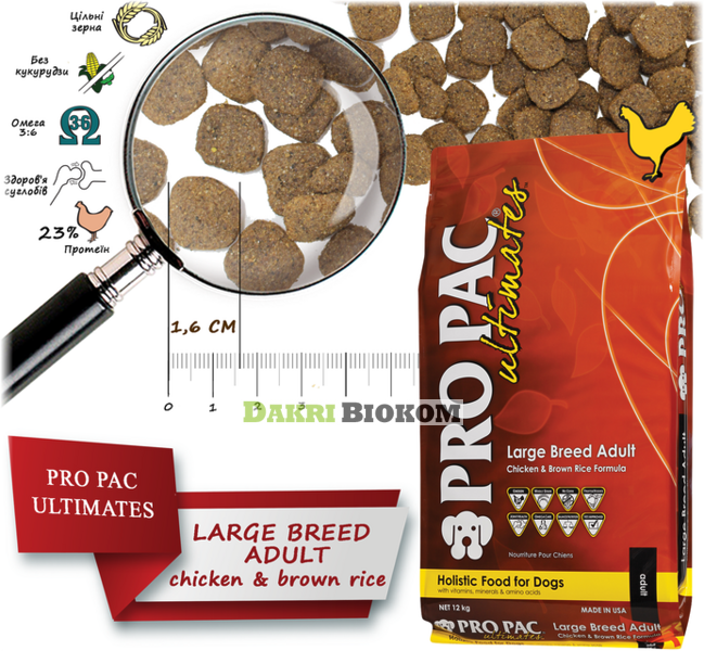 ПРО ПАК Ультіматс Лардж Брід Едалт Чікен енд Браун Райс Формула – це повноцінний поживний збалансований раціон для собак великих та гігантських порід, що містить глюкозамін та хондроїтину сульфат, без штучних барвників, ароматизаторів та консервантів. Колір гранул може відрізнятись природно. Лардж Брід Едалт розроблений у відповідності до харчових норм, встановлених Американською Асоціацією Контролю Якості продуктів (AAFCO) щодо вмісту нутрієнтів в кормі для дорослих собак.