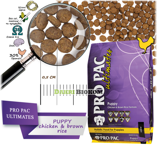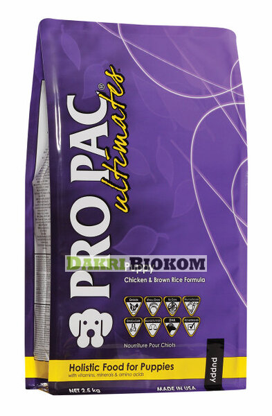 PRO PAC Ultimates Puppy Chicken & Brown Rice Formula – це свіжий підхід до харчування суперпреміум класу. Формула містить прості та поживні інгредієнти: курку (30%), цільні зерна рису (13%), білу рибу (6%), фрукти та овочі (8%).