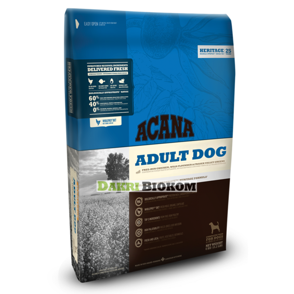 Высокопротеиновый и низкоуглеводный корм ACANA ADULT DOG, не содержит пшеницу, кукурузу, рис и глютен, которые часто вызывают расстройство пищеварения и аллергию. Напротив, ACANA ADULT DOG содержит полный набор полезных для здоровья фруктов и овощей (30%) из долины Оканаган, а также овес из Альберты - гипоаллергенный источник низкогликемических углеводов.